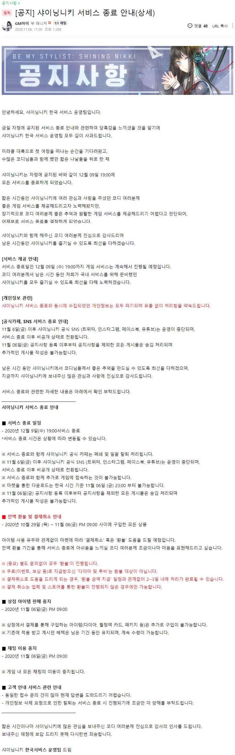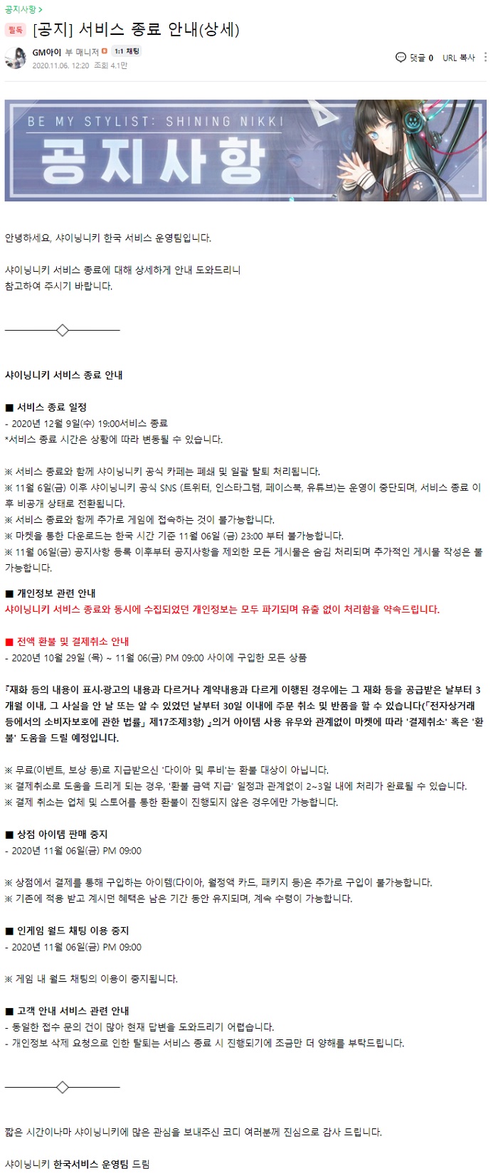 ▲ 최초로 게재된 샤이닝니키 서비스 종료 및 환불, 결제 취소 관련 공지 = 공식 커뮤니티 갈무리