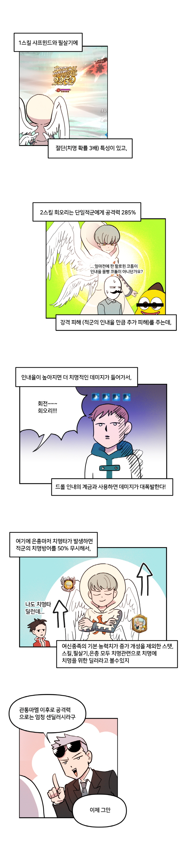 사리엘의 최대 특징은 치명타에 특화됐다는 점이다. 치명타 확률이 꽤 높은데다가 스킬에 '절단(치명타 확률 3배 증가)' 옵션도 있어 거의 모든 공격에 치명타를 기대할 수 있다. 또한 개성에 의해 치명타 발생 시 적 치명방어를 50%까지 무시하기 때문에 상당히 높은 대미지를 노릴 수 있다.