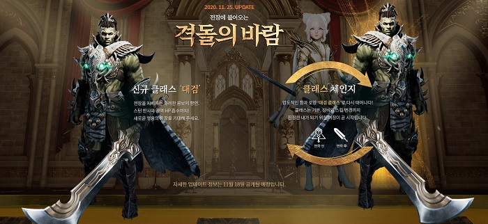 가장 먼저 눈에 띄는 것은 클래스 관련 업데이트이다. 오는 25일 격돌의 바람이라는 이름 하에 신규 클래스 '대검'과 '클래스 체인지' 기능이 추가된다.