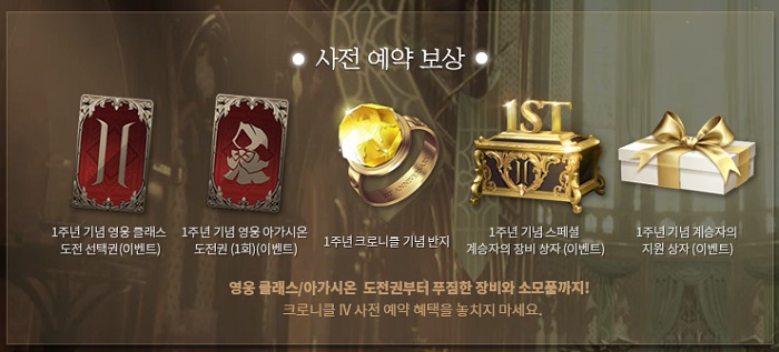 크로니클 업데이트와 관련해 엔씨소프트는 11일 사전예약을 시작했다. 24일까지 진행되는 이번 사전 예약 참여 시, 영웅 클래스/아가시온 도전권과 1주년 기념 크로니클 반지, 계승자의 장비 상자, 지원 상자 등을 제공한다. 복귀 유저에게는 60레벨까지 빠르게 레벨업할 수 있는 경험치 부스팅과 성장 혜택을 제공한다.