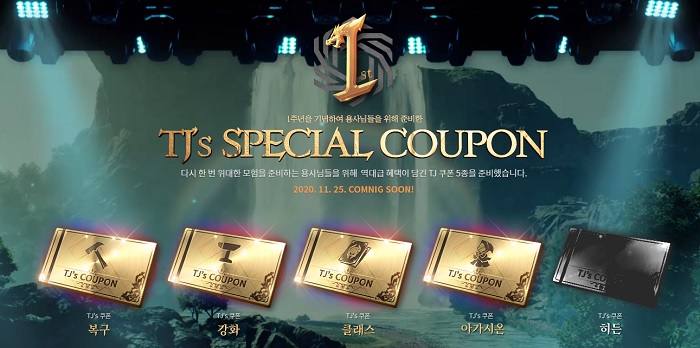 한편, 엔씨소프트는 오는 25일부터 2020년 12월 30일 정기점검 전까지 데일리 혜택 출석을 통해 TJ쿠폰 5종도 배포한다. 아이템 복구 쿠폰과 강화 재시도 쿠폰, 클래스 쿠폰, 아가시온 쿠폰, 히든 쿠폰 5종으로 플레이어의 이용 이력에 따라 적용된다. 이용 내역은 11월 11일 정오 이전까지의 이력을 대상으로 하기 때문에 TJ 쿠폰이 공개된 시점에서 아이템 강화 등을 통해 증발한 아이템은 적용되지 않으므로 주의가 필요하다.