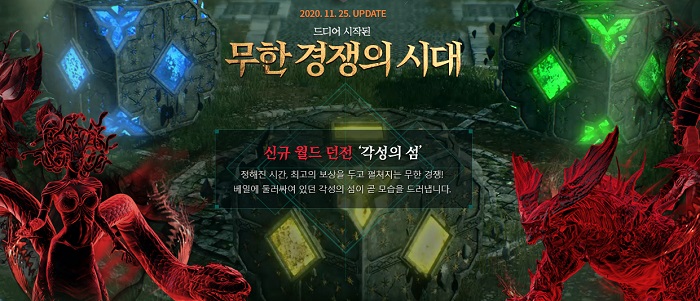 신규 던전 '각성의 섬'도 추가된다. 각성의 섬은 베오라의 유적, 오만의 탑, 네크로폴리스에 이은 4번째 월드 던전이다. 정해진 시간, 최고의 보상을 두고 펼쳐지는 무한 경쟁 던전으로 소개돼 네크로폴리스에 이은 새로운 PvP 콘텐츠가 될 것으로 기대를 모으고 있다.