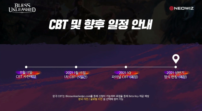 네오위즈가 선보이는 MMORPG 기대작 '블레스 언리쉬드'는 2021년 상반기 출시를 목표로 하고 있으며, 2021년 1월 15일 비공개 시범 테스트를 진행할 예정이다.