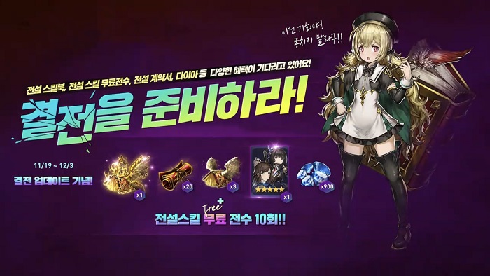 우선 두 차례에 걸쳐서 총 10회에 한해 전설 스킬 전수 비용 무료 이벤트가 진행되며, 결전 업데이트를 기념해 전설 스킬북과 전설 게약서, 다이아 등 다양한 혜택이 기다리고 있다. 복귀 이용자를 위한 복귀 이벤트도 준비돼 있으며, 신규 용병 코스튬도 추가된다.