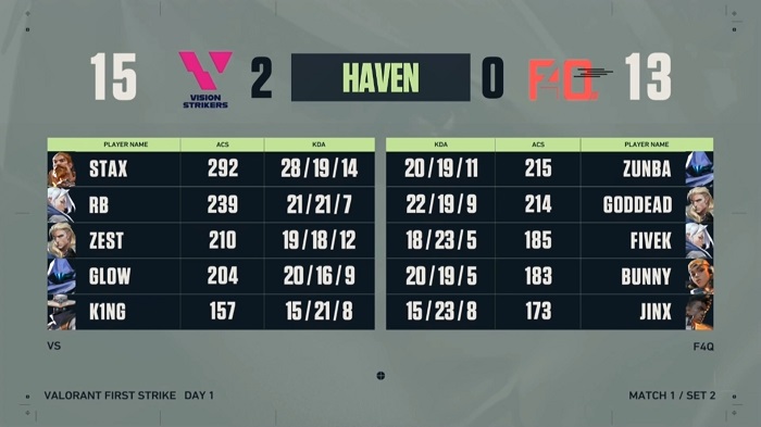 이후 스코어 차이를 동점으로 따라잡으며 상황을 반전시키고 듀스 상황까지 끌고 가는데 성공, 28라운드까지 끌고 가며 치열한 접전을 펼쳤지만 결국 VS 팀이 먼저 2라운드를 연승하면서 2세트까지 따내 개막전의 승자로 거듭났다.