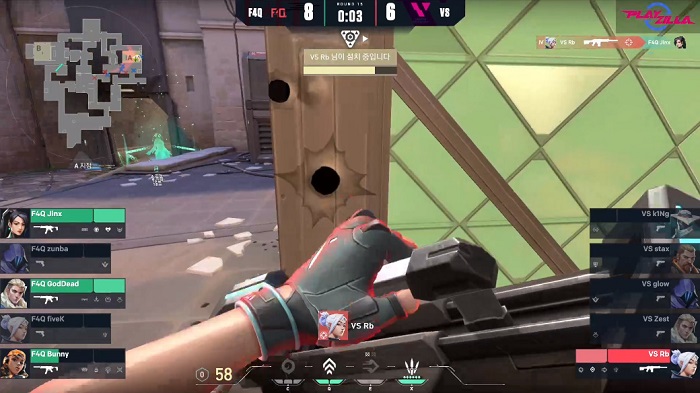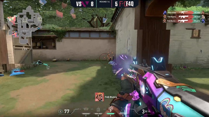 그렇게 단 한 번을 빼고 모든 라운드를 우승하며 이대로 2:0으로 세트가 종료되나 싶은 순간, 14라운드부터 F4Q 팀의 반격이 시작된다. 벽을 사이에 두고 Zumba 선수가 사이드스텝을 밟으면서 잠깐 동안 시야 차단을 한 틈을 Bunny 선수가 파고들어 순식간에 두 명을 정리하면서 반격의 신호탄을 울린다.