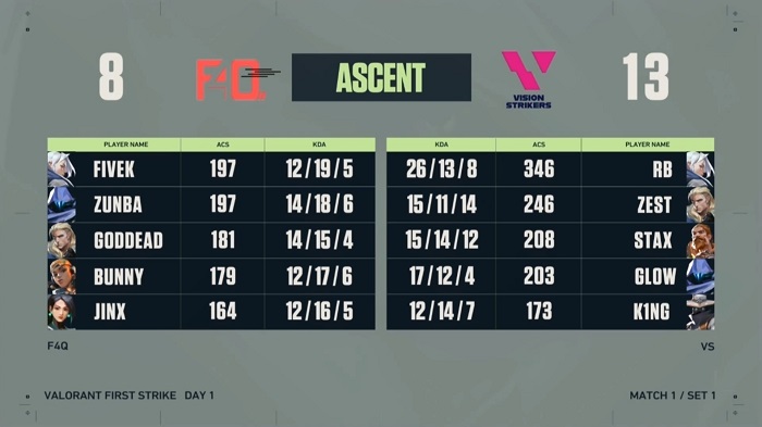 댄스팀 독특크루의 2분가량 되는 오프닝 무대로 시작한 개막전은 VS 팀과 F4Q의 경기가 이루어졌다. 먼저 VS 팀은 카운터 스트라이크 프로팀 멤버가 그대로 발로란트로 전향한 팀으로 기존까지 참가한 14개 대회를 전승해오며 국내 발로란트 팀 중 가장 강력하다는 평가를 받고 있다.