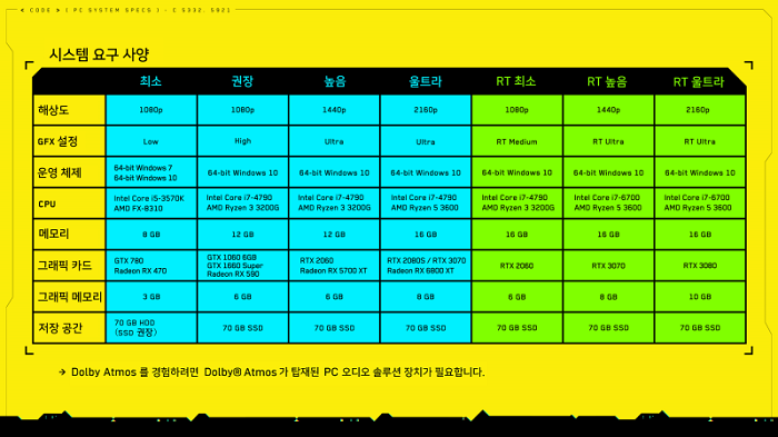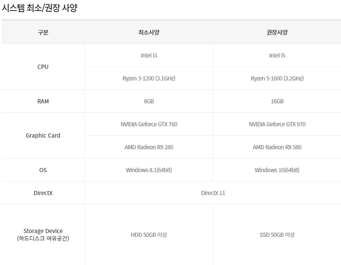 다만 CPU는 그렇지 않은데 최소 사양이 Intel Core i3-8300 (AMD Ryzen 3 1200)급이 필요하며 권장사양 Inter Core i5-10400 (AMD Ryzen 5 1600)까지 요구한다.