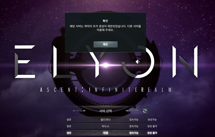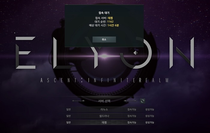 예정돼 있던 10일 오후 2시에 엘리온의 서버가 전격 오픈하자마자, 많은 이용자가 몰렸고 기대작임을 증명하듯 대기열이 발생했다. 특히 유난히 많은 이용자가 몰린 '데켐' 서버의 경우는 대기 순번 2,000번, 그리고 예상 대기 시간 2시간을 넘어섰다. 또한 캐릭터 생성 제한이 걸리는 모습도 확인할 수 있었다.