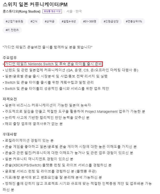 또한 '스위치 일본 커뮤니케이터/PM' 구인 모집글의 주요업무와 자격요건을 살펴보면 '일본/글로벌 콘솔 출시 시장분석 및 사업/홍보 전략 리서치 및 실행', '일본어 비즈니스 커뮤니케이션이 가능한 일본어 능숙자' 등이 명시돼 있음에 따라, 콘솔 버전의 일본 게임 시장 진출을 노리고 있는 것으로 해석된다.