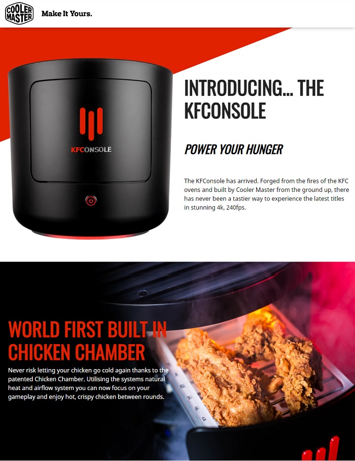 지난 9월, 스팀을 통해 '사랑해요, 샌더스 대령!(I love you, colonel Sanders!)'이라는 시뮬레이션 게임을 출시한 KFC가 이번엔 'KFConsole'이라는 이름의 콘솔 기기를 제작할 것이라 밝혔다.