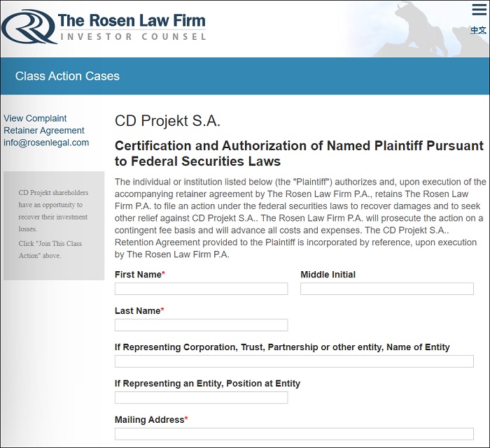 이런 내용을 바탕으로 집단 소송을 진행할 예정이라고 밝힌 로젠 로펌은 현재 온라인 양식 제출 사이트를 만들어 2020년 1월 16일부터 12월 17일까지 CD 프로젝트 레드의 증권 구매자 명단을 모집 중에 있다.