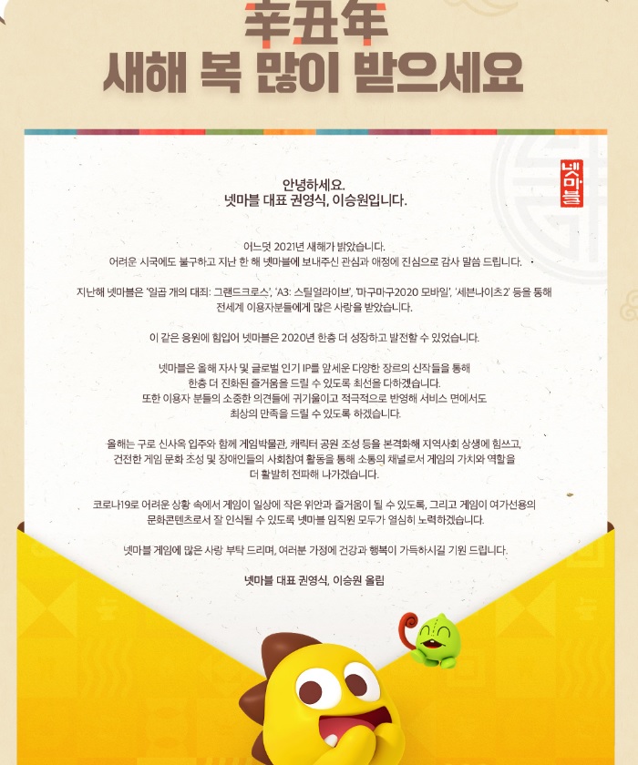 넷마블은 4일 넷마블 게임 포털 사이트에 권영식, 이승원 각자대표의 신년 메시지를 게재했다.