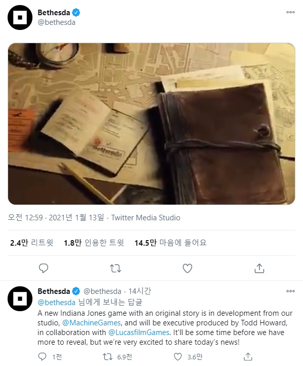 신규 타이틀은 바로 '인디아나 존스'로, '루카스필름 게임즈'와 '머신게임즈'가 개발을 담당하며 베데스다는 유통을 맡을 예정이다.