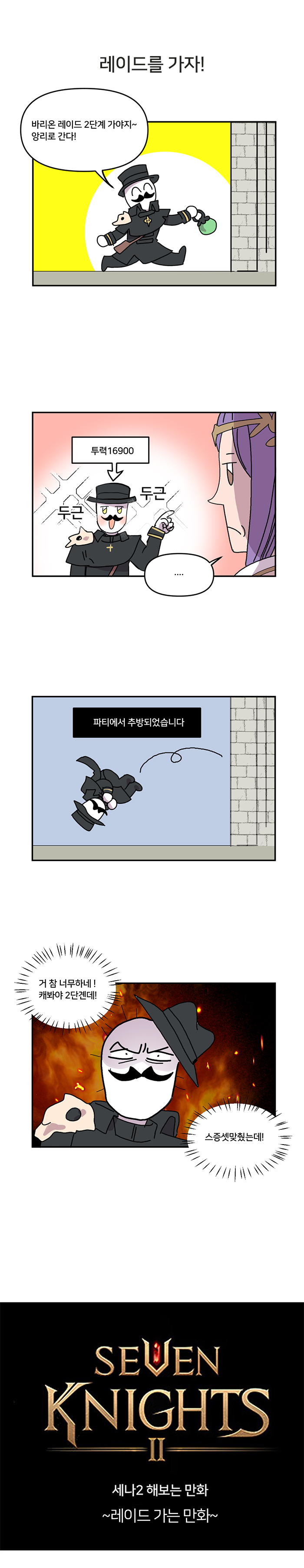 게임조선을 통해 연재하고 있는 국도 작가의 세나2 하는 만화는 세븐나이츠2 유저라면 누구나 공감할 수 있는 소재를 작가만의 코믹한 발상으로 그려낸 웹툰이다. 이번화에서는 멀티 레이드에서 발생하는 강퇴 기능과 제압기/저항 영웅을 핵심 소재로한 레이드 이야기를 독특하게 그려냈다.