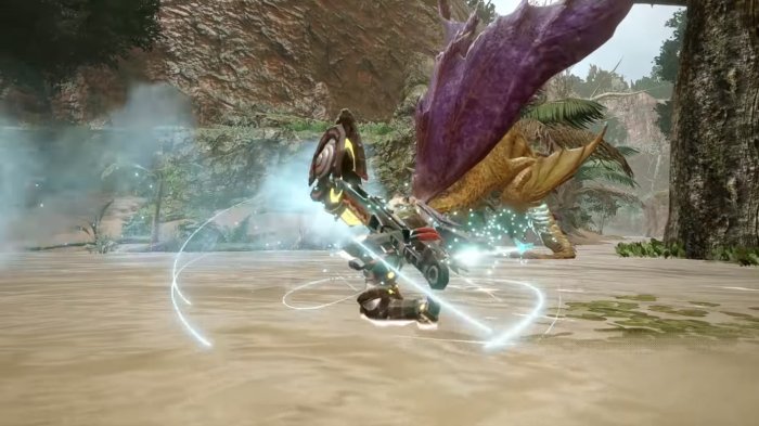 영상으로 등장한 몬스터 헌터 라이즈의 차지액스 역시 기존 차지액스와 큰 차이는 없어 보였습니다. 검 공격으로 병 게이지를 모아 몬스터의 빈틈을 노린 공격, 혹은 방패로 가드 후 초고출력 속성해방 베기로 역전하는 모습 등입니다. 여전히 느린 모션 역시 아쉬운 부분이었습니다.