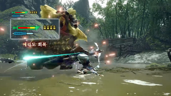 하지만 이런 아쉬움을 단번에 날린 장면이 바로 벌레철사 기술인 '카운터 풀 차지'입니다. 몬스터의 공격을 가드 하는 동시에 병 게이지를 충전하고, 여기에서 초고출력 속성 해방 베기까지 이어집니다. 그야말로 편의성과 로망 두 마리 토끼를 모두 잡은 최상위 기술이라고 하겠습니다.