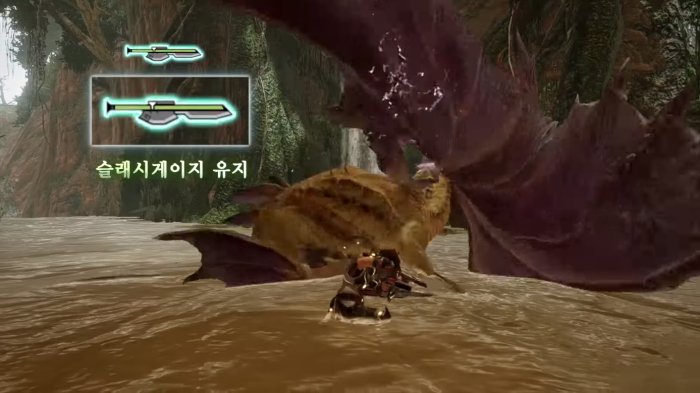 세기말 '매미슬액'으로 재미를 봤던 슬래시액스입니다. 검과 도끼를 오가며 슬래시 게이지를 모으고, 이를 사용해 말뚝딜을 하거나 속성해방찌르기를 하는 기본 운용은 그대로인 것으로 보입니다. 그러나 몬스터 헌터 라이즈의 슬래시액스는 건랜스와 마찬가지로 벌레철사 기술 추가로 인해 편의성 부분에서 큰 상향을 받았습니다.