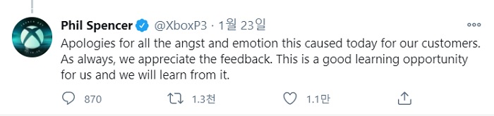 마이크로소프트의 게임 부문 총책임자 '필 스펜서 (Phill Spencer)'는 가격 인상과 관련된 트윗을 남기면서 게이머에게 다시 한 번 사과을 말을 전했다. 필 스펜서는 "오늘 발생한 일로 인해 불안한 감정을 가지게 해 사과드린다", "언제나 그렇듯 피드백에 감사드린다"고 밝히면서 "이번 일은 우리에게 좋은 배움의 기회이며 이를 통해 배울 것"이라고 말했다.