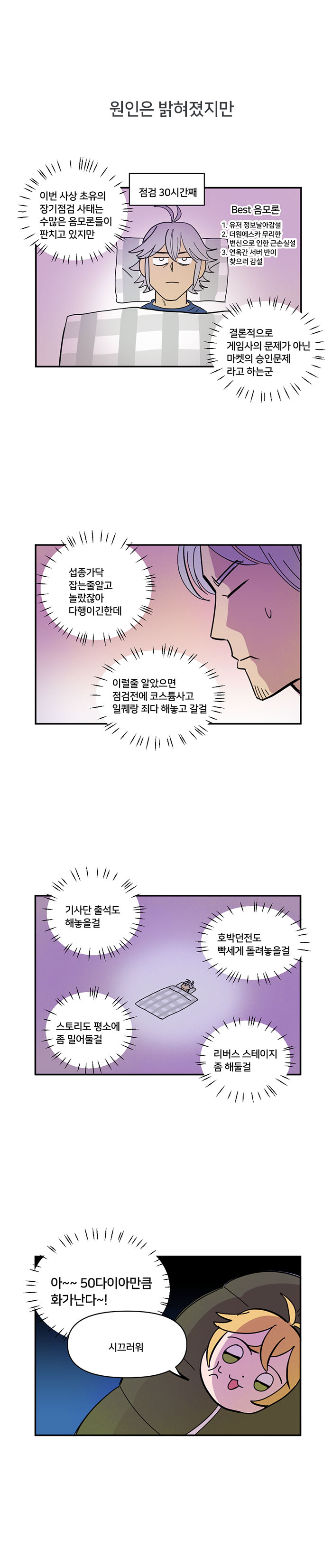 '점검은 괴로워' 편은 지난 1월 14일 있었던 서버 점검 사태를 다루고 있다. 여느때와 다르지 않았던 정기점검과 업데이트가 구글 마켓의 심의 지연으로 열리지 않게 된 사건으로 당초 2시간 남짓 예상됐던 점검이 당일을 넘어 다음날 늦은 시각까지, 총 30시간이 넘는 시간동안 닫히게 된 것.