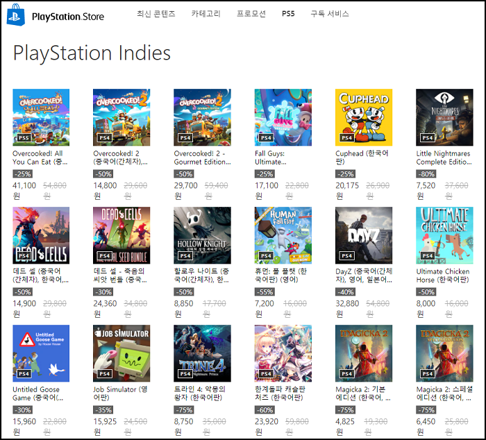 최대 85%까지 저렴한 가격으로 판매중인 인디 걸작 게임들 = 플레이스테이션 상점 페이지 갈무리