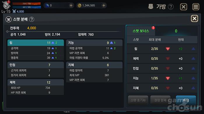 권장 분배 시에는 힘과 지능을 동시에 올린다. = 게임조선 촬영