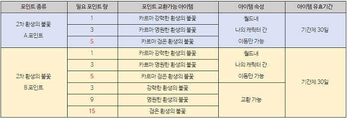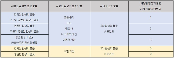 보상은 2019년 2월 1일부터 2021년 2월 24일 오후 6시까지 데이터에 따라 실제 사용한 아이템 재화에 따라 포인트를 지급하며, 이를 통해 원하는 형태의 해당 콘텐츠 아이템을 구매할 수 있는 방식이다. 예를 들어 환생의 불꽃 사용량에 따라 해당 포인트를 지급하고, 이를 통해 원하는 환생의 불꽃을 구매할 수 있는 형태다.