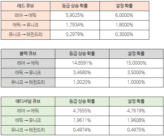 또한, 2020년 하반기 실제 게임 로그를 기반으로 설정해둔 확률과의 검증 결과를 공개해 실제 확률이 설정해둔 확률과 유사하게 적용됐음을 밝히기도 했다.