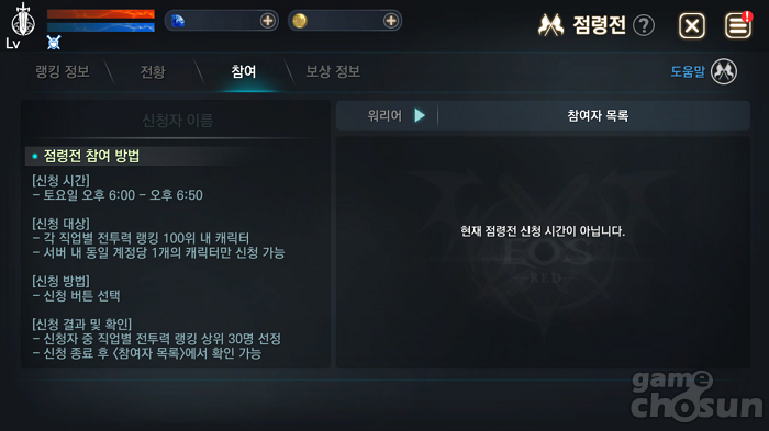 점령전은 토요일 오후 6시부터 50분간 참여신청할 수 있다. = 게임조선 촬영