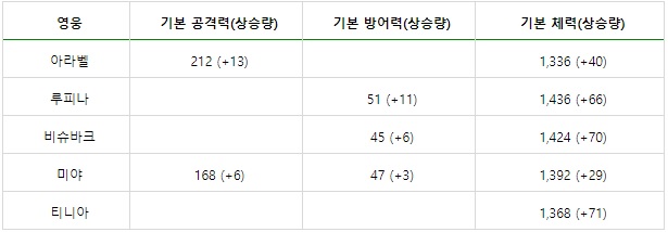 밸런스 조정의 대상으로는 '아라벨'과 '루피나', '비슈바크', '미야', '티니아'가 있다. 이중 아라벨의 경우 기본 공격력과 기본 체력이 상향 조정되며, 루피나 및 비슈바크는 기본 방어력 및 기본 체력이 상향된다. 또 미야는 기본 공격력과 기본 방어력, 그리고 기본 체력 모두 증가될 예정이며 티니아는 기본 체력이 상향 조정된다.