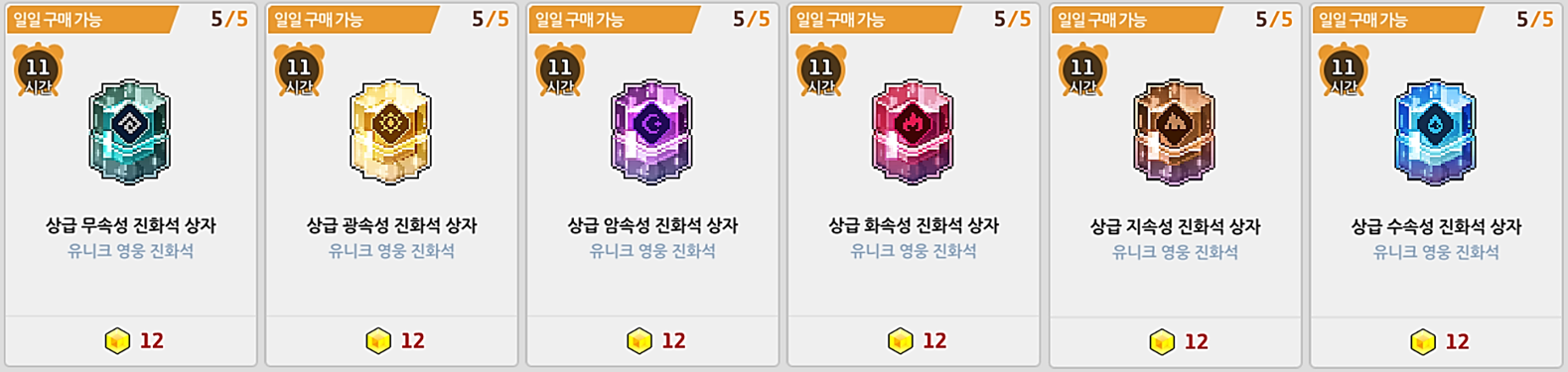 상점에서 선악의 상급 진화석 상자와 원소의 상급 진화석 상자 두 종류로 판매되었던 진화석 상자가 속성에 따라 분류돼 판매된다. 즉 이용자는 자신이 원하는 속성의 3성 영웅 조각을 좀 더 쉽게 획득할 수 있게 된다. 각 속성별 상급 진화석 상자는 하루 5회 구매할 수 있으며, 기존의 선악 및 원소의 상급 진화석 상자는 더 이상 판매하지 않는다.