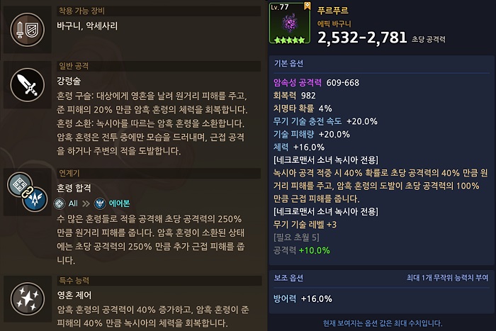 일반 공격으로는 '강령술'을 사용하는데, '혼령 구슬'과 '혼령 소환'으로 나뉜다. 혼령 구슬은 원거리 공격을 가함과 동시에 가한 피해량의 일정 비율만큼 소환수의 체력을 회복한다. 다음으로 혼령 소환은 소환수를 불러내는 스킬이며, 소환수는 적에게 근접 공격을 가하며, 주변의 적을 도발할 수도 있다.