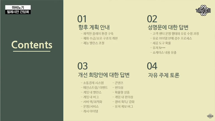 민경훈 디렉터는 자신도 유저분들도 마비노기를 사랑하는 마음은 같을 테지만 유저들의 목소리를 충분히 경청하지 못해 많은 불많이 있었던 점을 충분히 인지하지 못했던 점을 사과하며, 사전 설문 조사를 통해 나온 불만 중 가까운 시일 내 조치가 가능한 서버 렉 감소, 은행 입금 수수료 삭제, 던전 보상 상향, 재능 밸런스 조절 등을 빠르게 조치하겠다고 밝혔다.