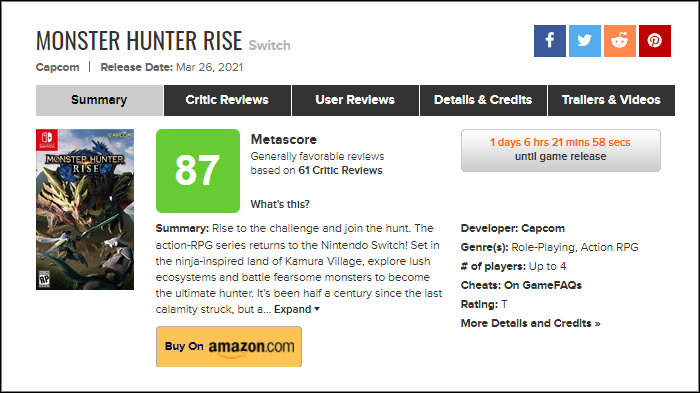 캡콤의 신작 헌팅 액션 '몬스터 헌터 라이즈'가 리뷰 집계 전문 '메타크리틱'과 '오픈크리틱'에서 평점 87점을 기록했다.