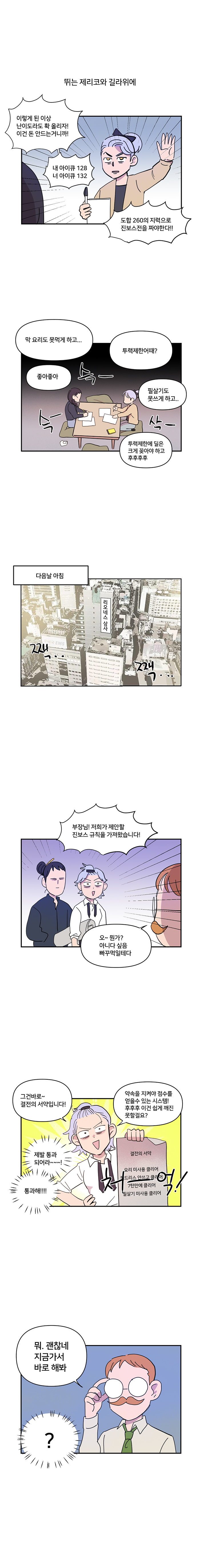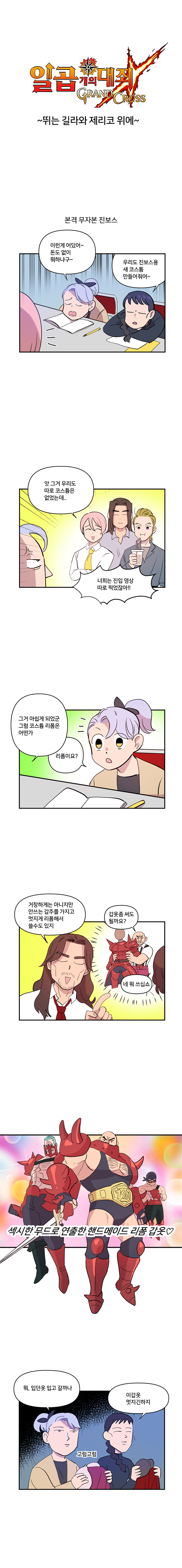 '뛰는 제리코와 길라 위에' 편은 지난 3월 18일 업데이트 된 '제리코&길라' 진보스전을 조명한 웹툰으로 해당 진보스전은 기존까지 재등장한 진보스전을 일신하고 완전히 새롭게 등장한 것이 특징이다. 사실 두 영웅은 일곱개의대죄 극초반기 사랑받았던 영웅들로 십계와 사대천사가 조명받는 현재에 이르러 그 쓰임새가 크지 않은 영웅인 것이 사실.