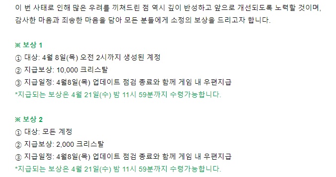 이에 게임 운영에 있어 부족한 점이 있었음을 인정하고 앞으로는 보다 세심하게 개선이 될 수 있도록 재차 노력할 것이라고 전했다. 또 독버섯맛 쿠키 캐릭터의 스킬 툴팁 수정에 오랜 시간이 소요된 것에 대해서는 사과의 이미를 담아 보상을 지급하기로 결정했다.
