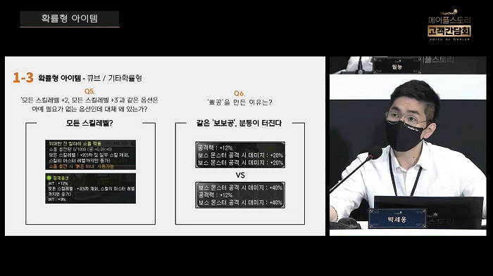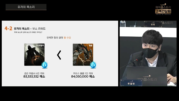 한편, 시간 관계상 다루지 못한 질문 내용(게임 내 경제, 보스 마일리지 등)은 107개의 개선안이 담긴 내용을 서면으로 전달받아 답신할 것을 약속했다.