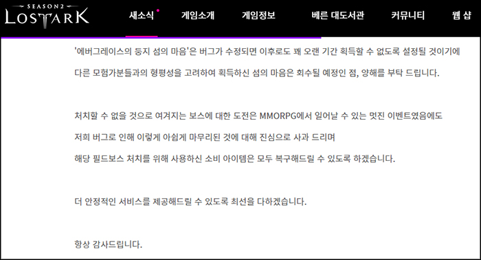 버그가 발생하자 스마일게이트는 공식 홈페이지 공지를 통해 "다른 모험가분들과의 형평성을 고려해 획득한 섬의 마음은 회수될 예정인 점, 양해 부탁드린다"라고 밝히며, "처치할 수 없을 것으로 여겨지는 보스에 대한 도전은 MMORPG에서 일어날 수 있는 멋진 이벤트였음에도 저희 버그로 인해 이렇게 아쉽게 마무리된 것에 대해 진심으로 사과드린다"라며 불가능에 대한 유저들의 도전을 '멋진 이벤트'라고 전했다.