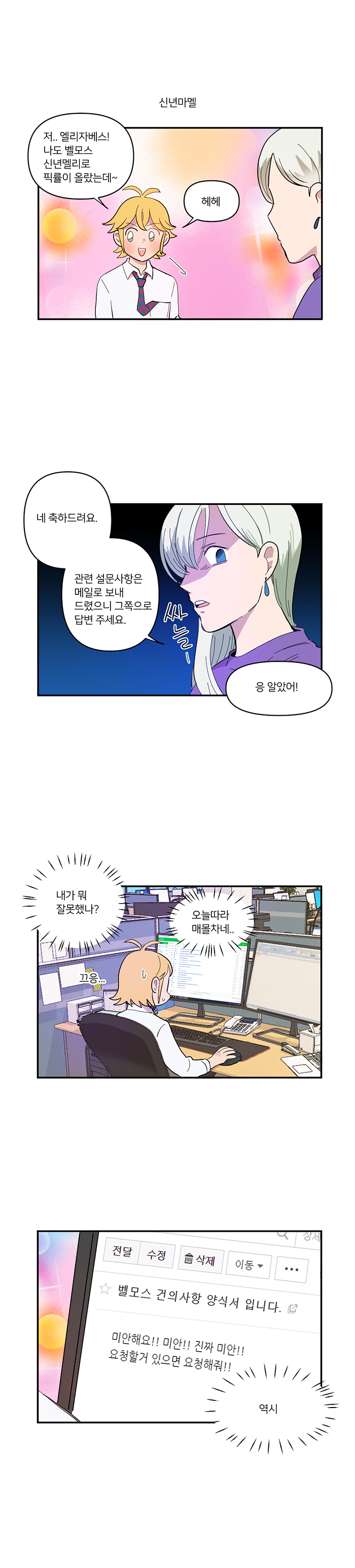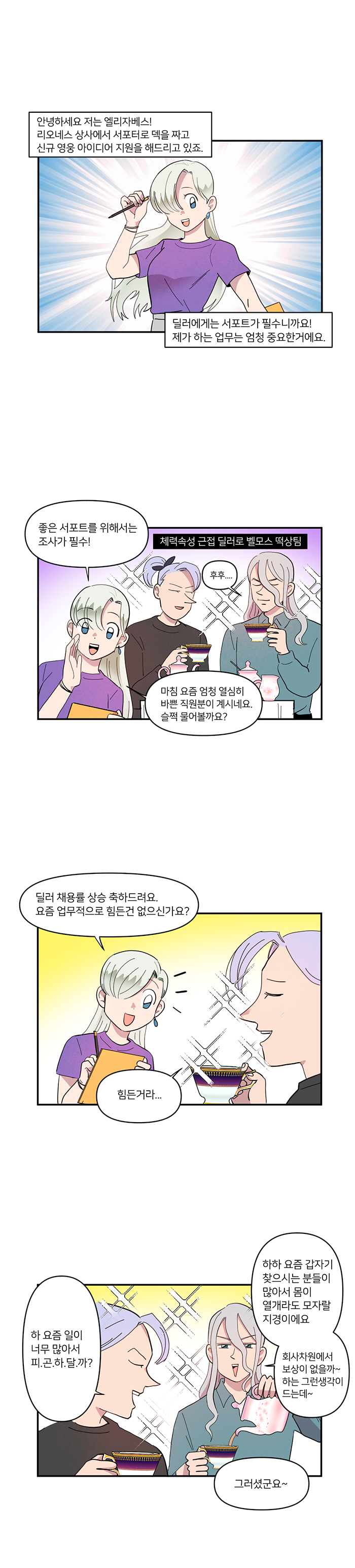 '그 남자 그 여자의 사정' 편은 해당 웹툰에서 자주 등장하는 '리오네스 상사' 외전, 그 중에서도 엘리자베스와 멜리오다스의 사내 연애 이야기를 다루고 있다. 엘리자베스는 사내에서 딜러를 보좌하는 서포터 역할을 수행하면서 짬짬이 멜리오다스와 연애도 한다는 설정.