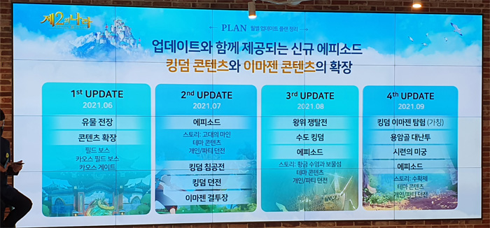 6월 10일 론칭 이후 대략적인 업데이트 일정도 공개됐다. 매월 꾸준히 즐길만한 굵직한 업데이트를 추가하겠다는 것이 주요 목표로 6월은 유물 전장과 콘텐츠 확장, 7월은 신규 에피소드와 킹덤/이마젠 관련 콘텐츠, 8월은 왕위 쟁탈전 등 PVP 관련 콘텐츠, 9월은 킹덤 이마젠 탐험, 용암골 대난투 등의 업데이트 등이 예정돼 있다.
