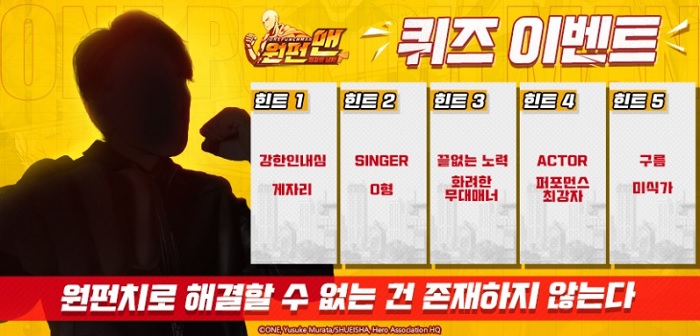 지난 5월 27일부터 진행된 '실루엣 퀴즈 이벤트'는 이벤트명에서 유추할 수 있듯이, 원펀맨: 최강의 남자에 새롭게 기용될 인물의 실루엣을 확인하고 광고모델을 맞히는 형태로 진행됐다. 이벤트가 공개된 날부터 하루 두 가지씩 힌트를 공개하며, 이용자는 힌트를 토대로 유추해 정답을 맞히면 된다. 정답을 맞힌 추첨을 통해 1명에게 '광고모델 포스터'를, 그리고 20명에게 다이아 100개 및 강자 소환권 3장, 체력 30개 등으로 구성된 '광고모델 퀴즈 패키지'를 지급한다.