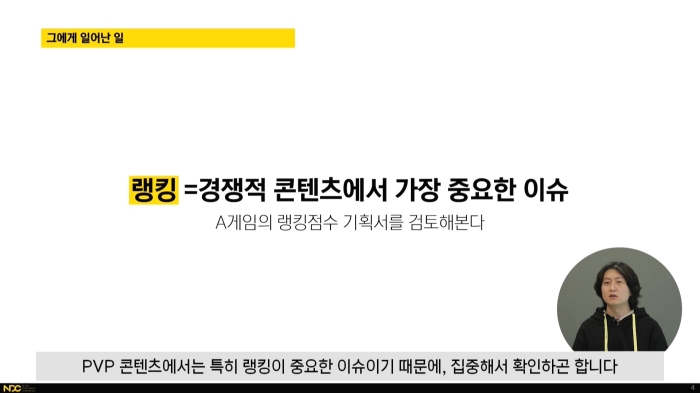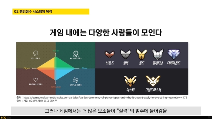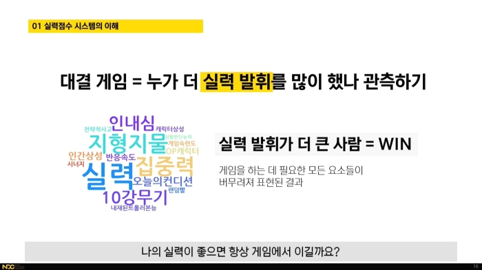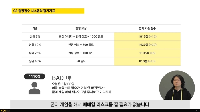 이에 대해 네오플 액션스튜디오 BBQ 개발실 소속 김호용은 넥슨 인텔리전스랩스 매칭팀에서 재직했던 경험을 바탕으로 "실력 점수? 랭킹? 다 비슷한 거 아닌가요"라는 강연을 진행했다. 강연을 통해 랭킹 점수와 실력 점수, 매칭 시스템 간의 기묘한 상관관계를 설명했다.