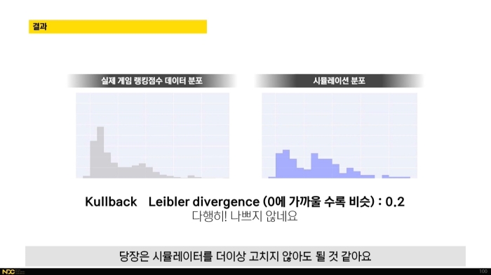 또한 여러 지표를 접목한 시뮬레이션은 강력한 기획 도구이며 시스템 특성에 맞게 만들어진 시뮬레이션 환경을 통해 라이브 적용 후 상황을 예측할 수 있다고 강조하며 강연을 마무리했다.