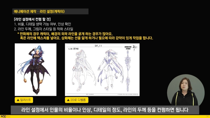 강연은 애니메이션 발주 전부터 제작 과정을 세세하게 설명하며 개발자가 클라이언트가 되어 애니메이션 제작자와 협의해야 할 점을 설명하는 방식으로 진행했다. 삽화체와 만화체의 차이를 설명하는 기초적인 내용까지 짚고 넘어가 애니메이션 관련 지식이 전혀 없어도 차분하게 따라갈 수 있었다.