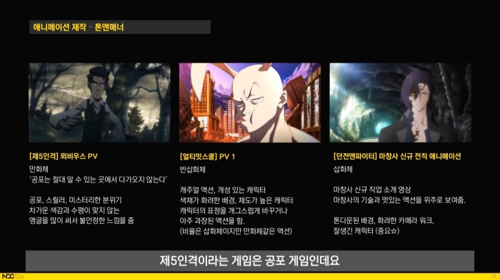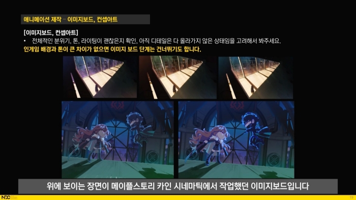 장선영 대표가 강조한 내용은 순서에 맞는 의견 교류를 통해 같이 완성을 향해 달려가는 과정이었다. 던전앤파이터, 메이플스토리, 에픽세븐 등 각기 다른 게임에서 만들었던 작업물을 예시로 색감, 앵글, 캐릭터 표정 등 세세한 설정이 뒷받침되어야 높은 수준의 영상이 나온다고 설명하면서 실제 작업 프로세스에 따라 의견을 주고받은 내역을 일부 공개했다.