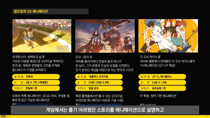 모든 애니메이션 제작 과정에 대한 설명을 마친 뒤에는 현재 게임 애니메이션의 현황과 미래에 대한 이야기로 이어졌다. 단순히 게임 내에서만 소비되는 것이 아닌 넷플릭스, 유튜브 등 동영상 제공 플랫폼에서 게임을 주제로 한 애니메이션의 활약을 설명했다.