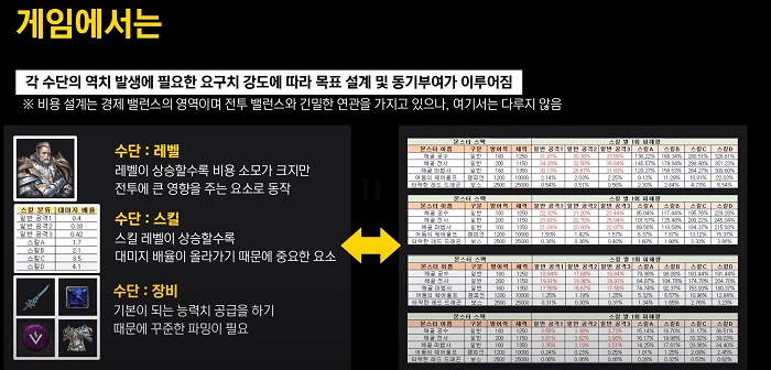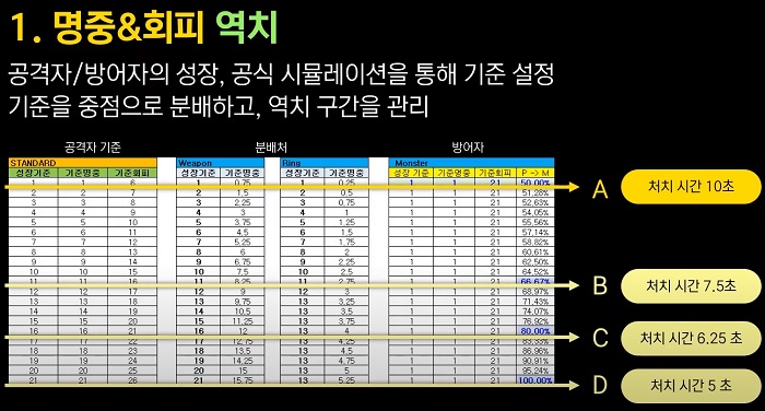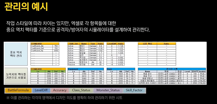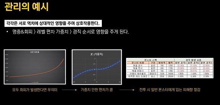 플레이어의 기준 능력치를 설계해 관리하는 영역과 스킬 효율을 관리하는 영역, 레벨 편차를 관리하는 영역, 다른 역치 팩터를 관리하는 영역으로 구분하고, 능력치와 팩터를 기반으로 기준값과 성장 요소를 고려해 플레이어가 상대하는 적과 교전했을 때 벌어지는 사건에 대한 밸런스를 관리하게 된다.