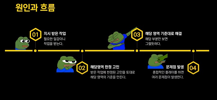 문제점이 발생한 흐름은 크게 세 가지로 나뉘었다. 첫째, 지시를 받았으니 작업을 진행하게 되었다는 점이며 둘째, 주어진 업무 영역에 한정된 고민을 토대로 기준을 만들었다는 점이다. 그리고 마지막으로 주어진 업무 영역을 기준으로 해결하다보니 해당 부분만 봤을 때는 그럴 듯해 보였다. 하지만 실제로 전투 테스트를 진행하니 여러 문제점들이 발생하게 됐다.