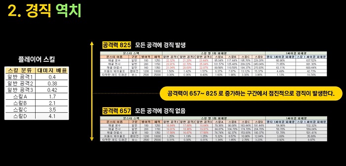 추가로 아래의 왼쪽처럼 플레이어의 스킬 대미지 배율이 설계돼 있으며 아래의 오른쪽 하단표처럼 몬스터 스펙이 설계돼 있다. 플레이어의 공격력이 657이라면 일반 공격으로 적을 공격하게 되는 경우에는 경직이 발동되지 않는다. 그리고 플레이어가 성장을 통해 공격력이 증가돼 825에 도달하는 시점부터 플레이어가 사용하는 모든 일반 공격은 대미지 비율이 20%를 넘게 되면서 아래의 오른쪽 상단표처럼 경직이 발생한다. 몬스터의 방어력과 체력 설계, 플레이어의 스킬 대미지 배율 설정에 따라서 공격력이 657에서 825로 증가하는 구간에서 점진적으로 경직이 발생한다. 이러한 성장 구간에서 얼마나 많이 몬스터에게 경직효과를 줄 수 있냐에 따라서 역치 구간이 발생하게 된다.
