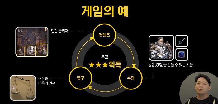 그렇다면 어떻게 역치를 효과적으로 관리할 수 있을까? 조찬만 게임 디자이너는 던전 콘텐츠를 예시로 역치 관리 방법에 대해 소개했다. 던전 클리어를 위해서는 강해져야 하며 유저의 캐릭터가 강해지는 방법에는 여러 가지가 존재한다. 플레이어는 자신의 상황에서 수단과 비용을 연구해 가장 적합하다고 생각되는 방법을 선택해 목표를 달성하려고 한다.